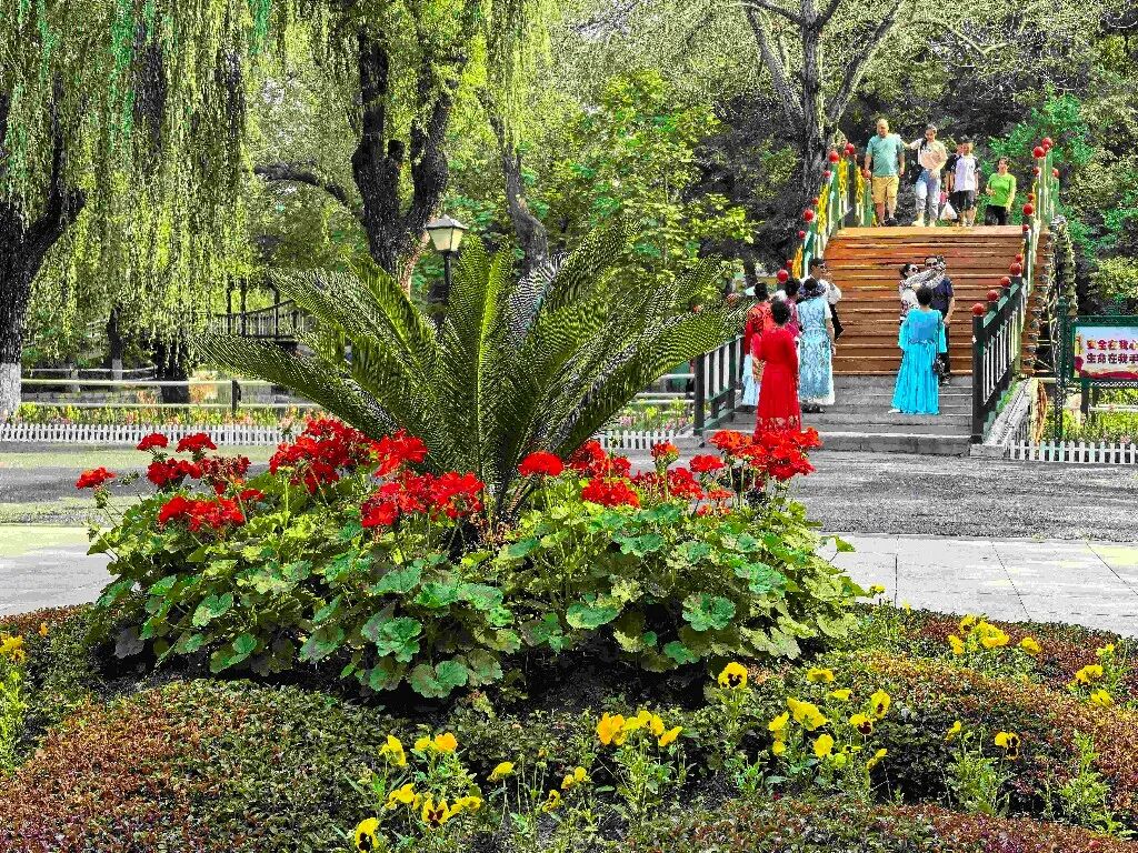 今年,兆麟公园彩化项目大放异彩。园内栽植的金鱼草、小丽菊、四季海棠、孔雀草等花卉,形成红、黄、粉、绿、银五大色系。放眼望去,宛若一条条彩带缠绕在绿树之间。同时,公园大色块片植露地花卉,点缀形式多样的花箱和花架,实现彩化景观平面与立体相结合,造型优美的彩化景观带给市民游客美美的感官享受。