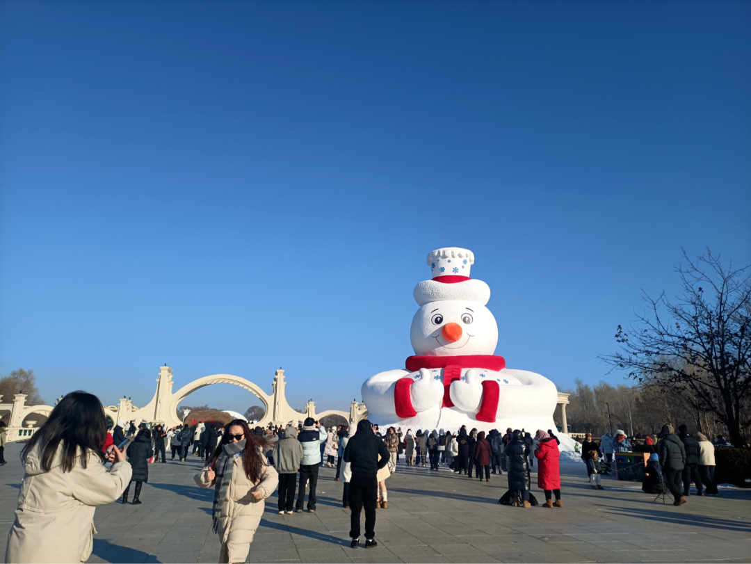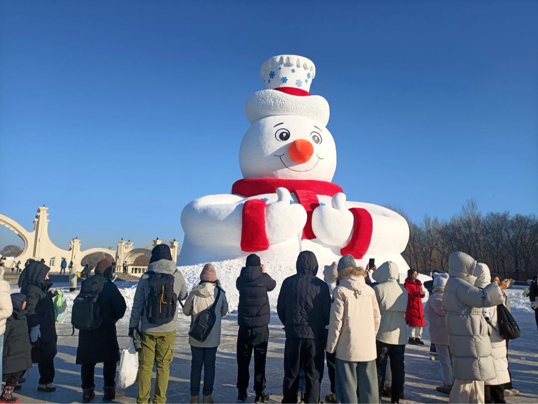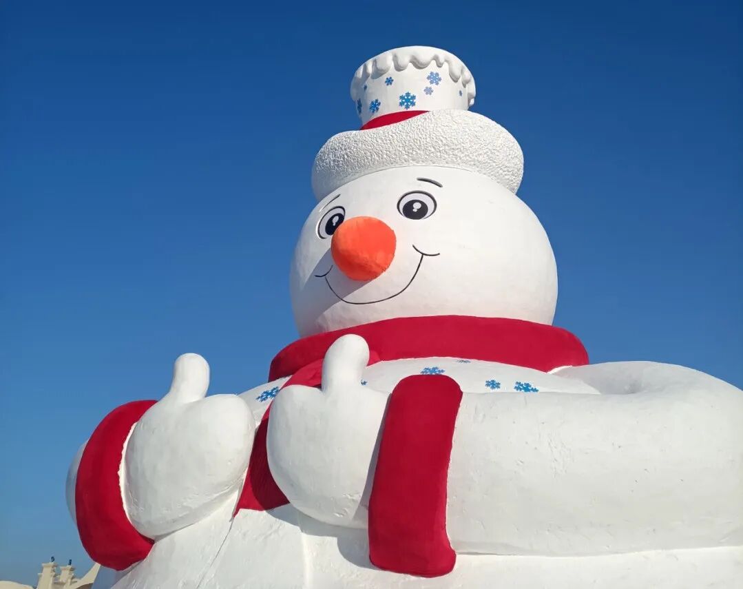 大雪人戴着高高的雪花礼帽、系着红围脖,圆圆的大眼睛、红红的鼻头,圆滚滚的模样呆萌可爱,双手竖起拇指欢迎来哈尔滨参加冰雪游的四海宾朋,仿佛在说“哈尔滨欢迎你”。