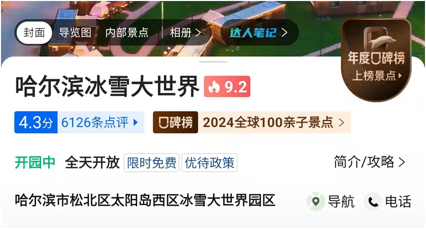 入选携程口碑榜“2024全球100亲子景点”,不仅是对哈尔滨冰雪大世界的肯定和鼓励,更是对海内外游客的诚意邀请。哈尔滨冰雪大世界将继续大力挖掘冰雪文化资源、创新冰雪科技应用、优化提升服务品质、激活文旅融合潜能,为游客提供更加丰富多彩的旅游体验。今年冬天,第二十六届哈尔滨冰雪大世界将张开热情怀抱,欢迎广大游客朋友的到来!