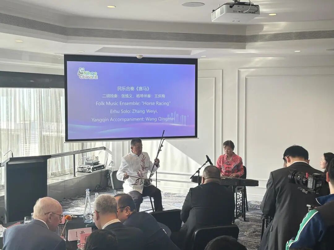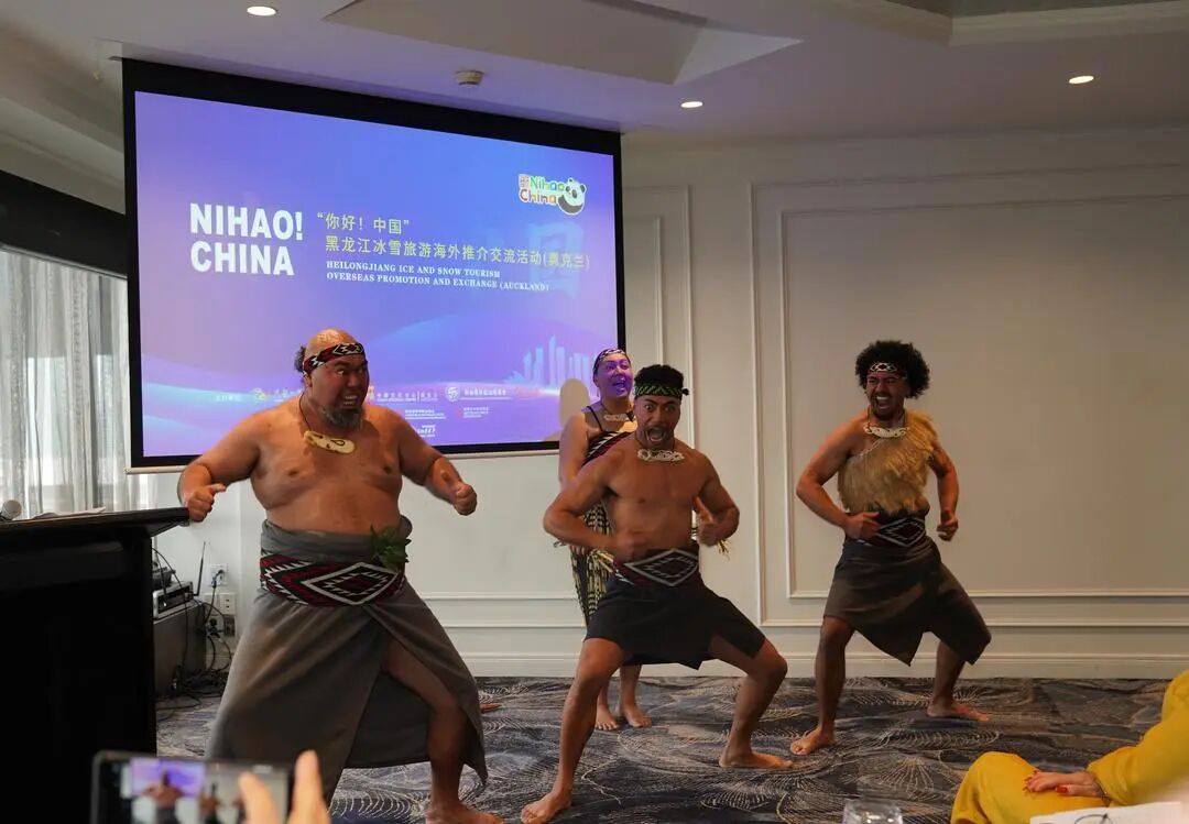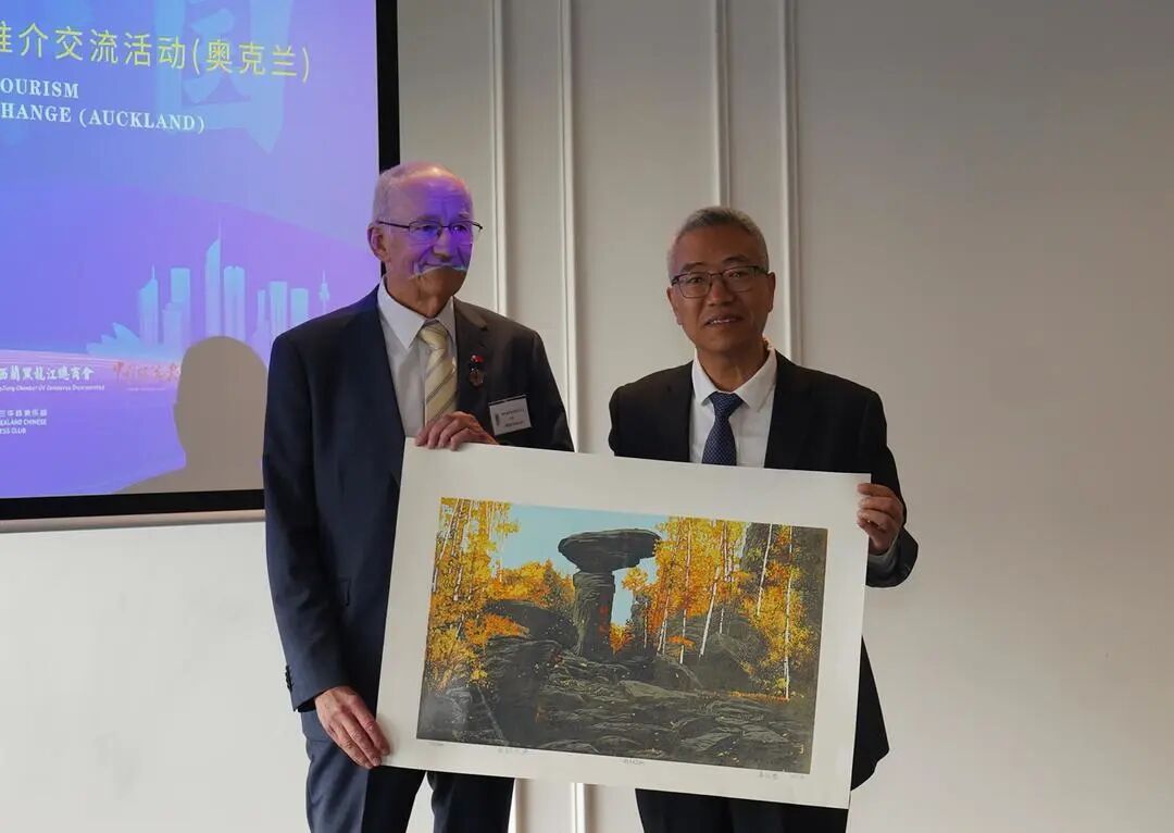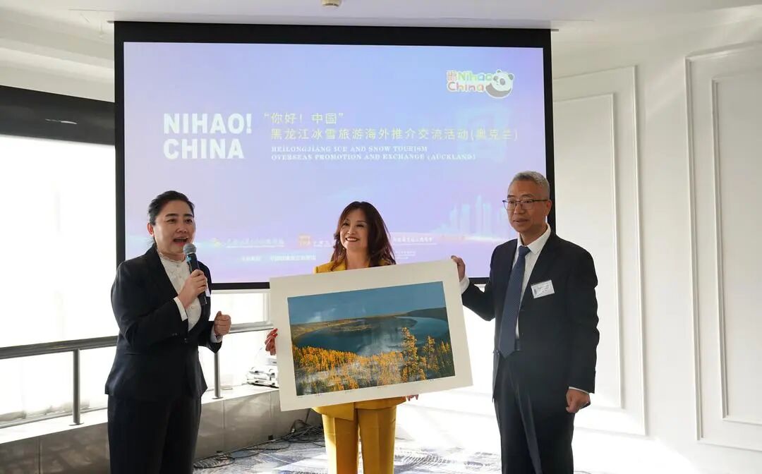 黑龙江省文化和旅游厅一级巡视员侯伟代表黑龙江旅游推介团赠予MIKE黑龙江版画中国驻奥克兰总领馆代表、新西兰华人国会议员陆楠、新中友好协会代表、黑龙江省文化和旅游厅一级巡视员侯伟、黑龙江省文化和旅游厅综合执法监督局局长李春江、黑龙江省鸡西市副市长周诚、黑龙江省牡丹江市文体广电和旅游局局长鄂艳娟、黑龙江省大兴安岭地区文体广电和旅游局局长杨影、新西兰黑龙江总商会会长赵文洁及新西兰各商会和媒体记者等70余人参加此次活动。