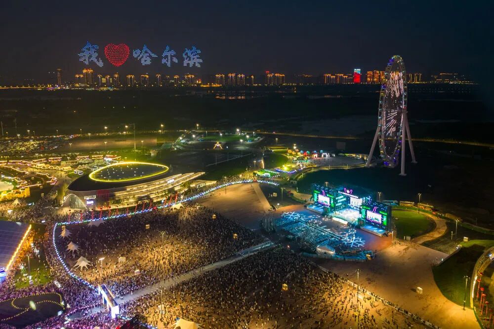 人们在哈尔滨国际啤酒节现场观看无人机表演。新华社记者 张涛 摄