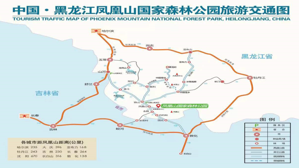 从哈尔滨市或吉林市出发,可沿吉黑高速(G1211)前往山河屯林业局,再沿雪乡公路(X217)前往凤凰山景区。整个行程需要3小时左右,途中经过山河服务区、铁山林场(凤凰山)服务区,您可在这里进行旅游咨询、休憩、购物和用餐。(特别提示:高山杜鹃(空中花园景区)花期为5月下旬至6月中旬)