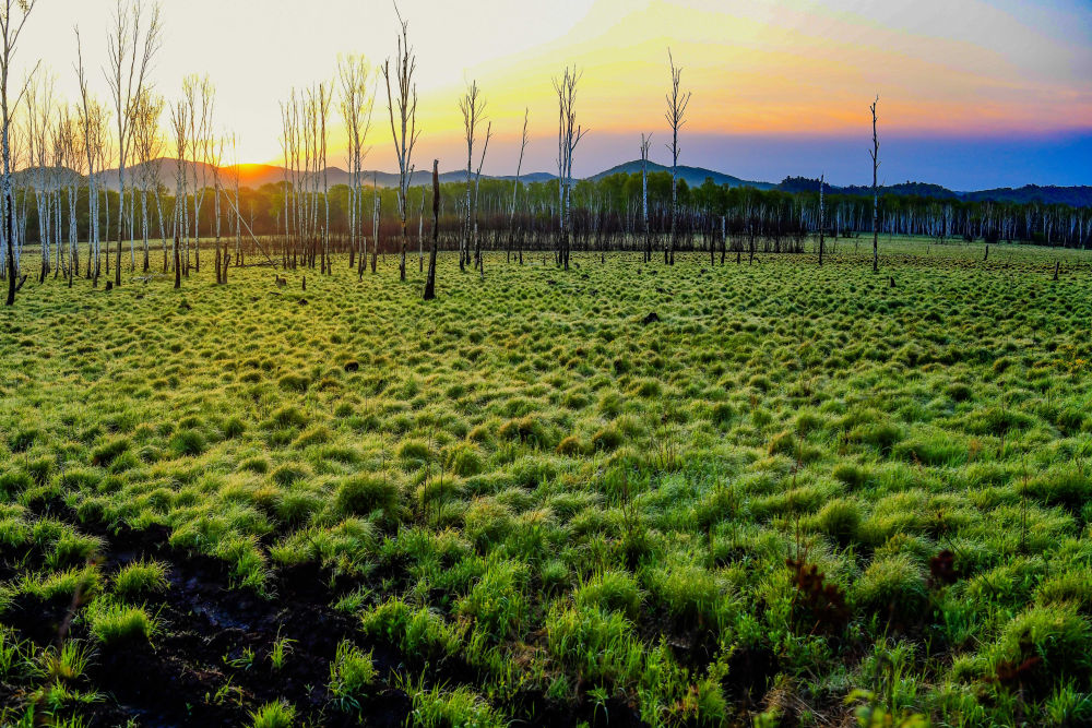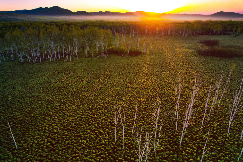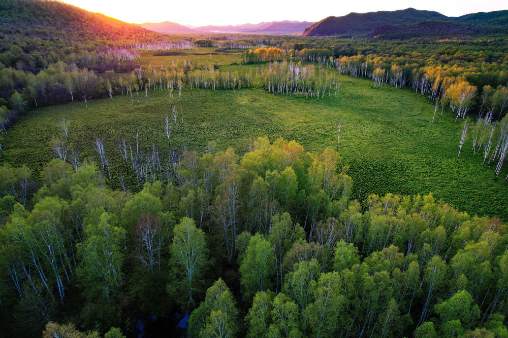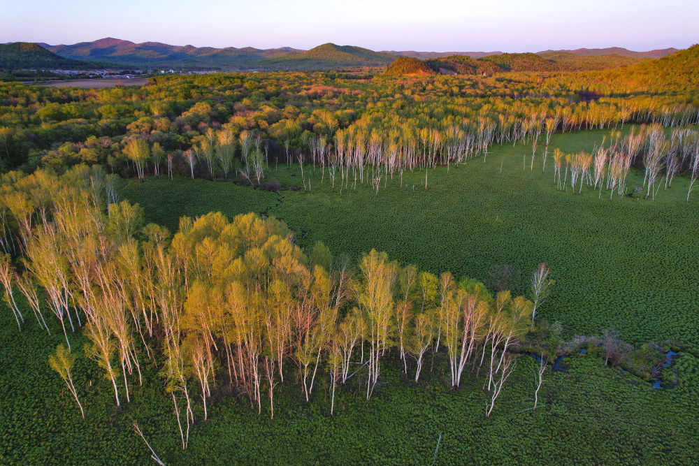 初夏时节,中俄边城黑龙江省双鸭山市饶河县的山林间碧意横流。一簇簇白桦树,从万顷绿海中跃然而出,仿佛亭亭玉立的白衣“仙子”,在夕阳金辉勾勒下,温柔铺展开妩媚的画卷。