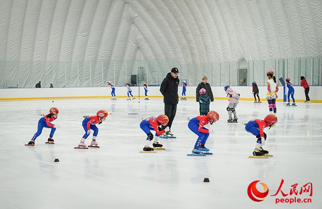 哈尔滨道外区冰上运动中心气膜馆内,青少年学习速滑技巧 人民网记者 苏靖刚摄