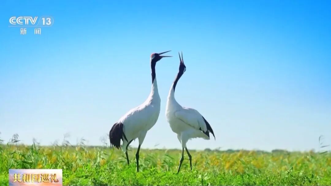 丹顶鹤引吭向天歌,把芦苇荡倒映的白云唤醒。
