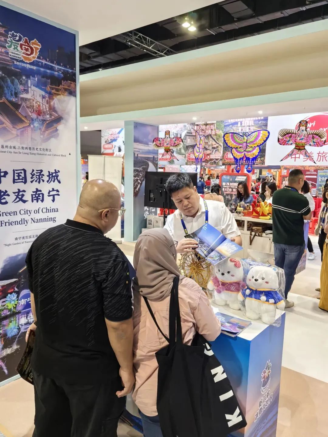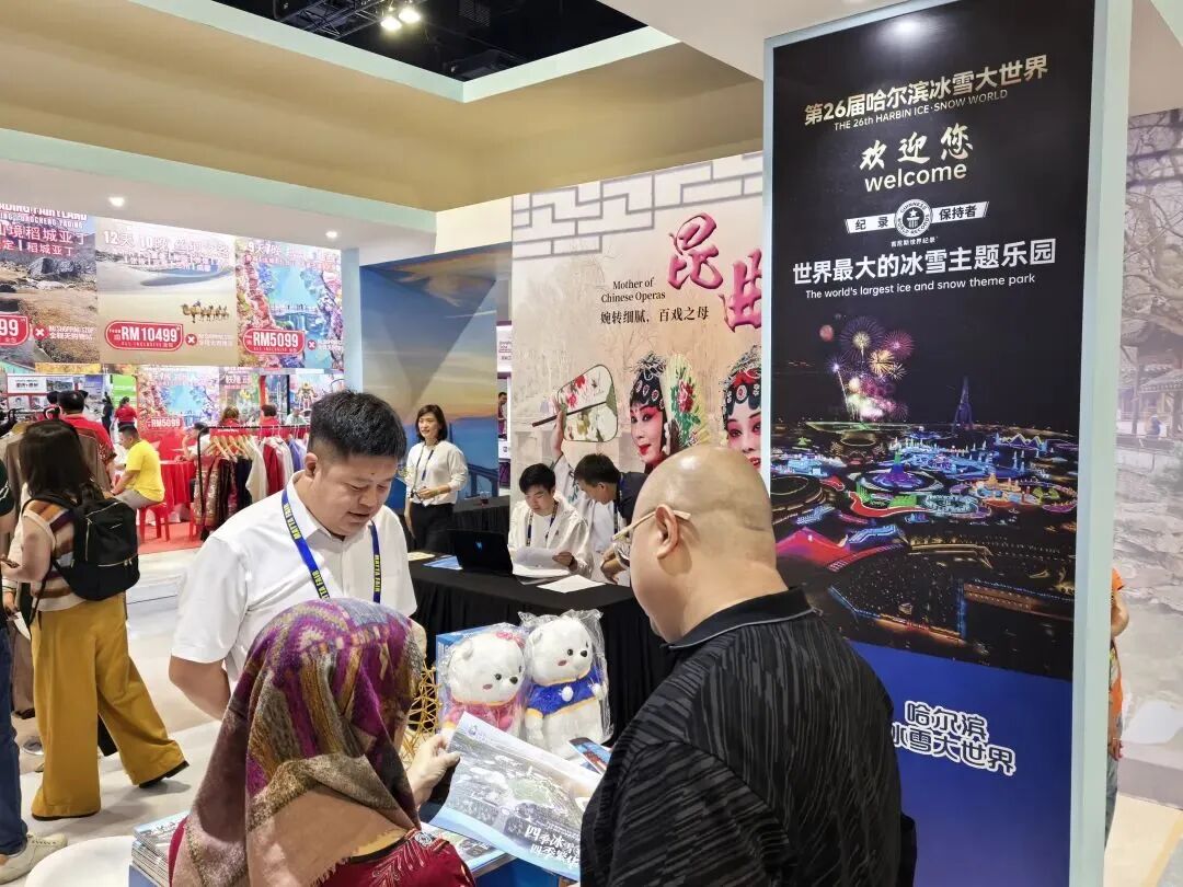 展会期间,哈尔滨冰雪大世界展出的精美展板和文创产品在展区非常抢眼,工作人员现场派发景区宣传册,并积极与现场游客互动,吸引了大量的东南亚游客的关注和咨询,成为展会热门区域之一。