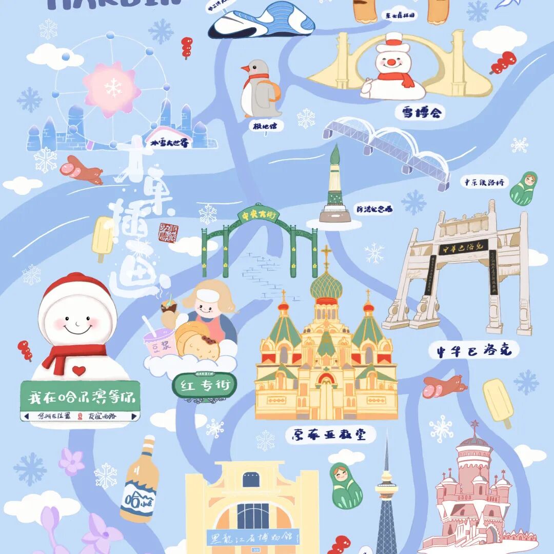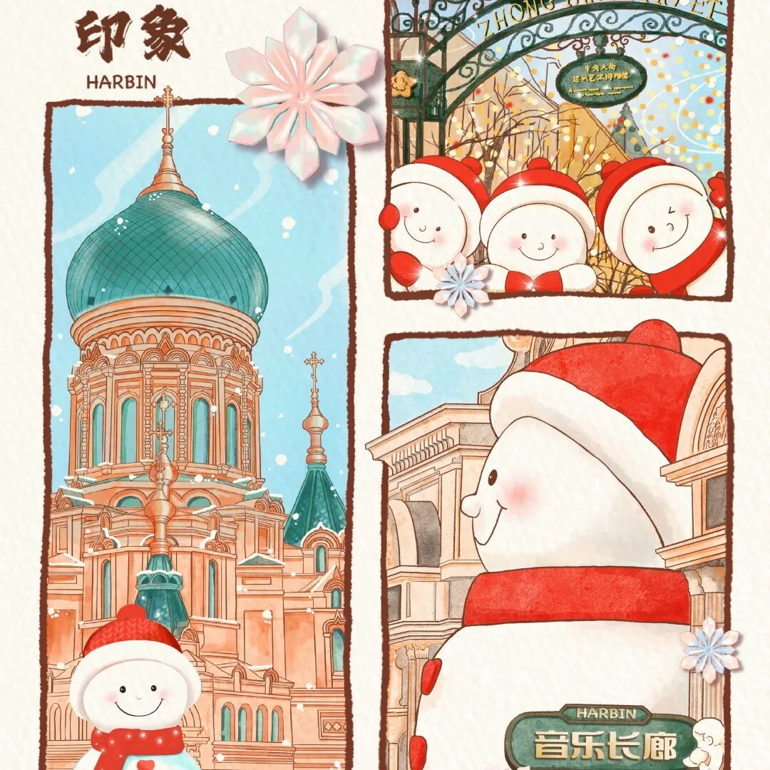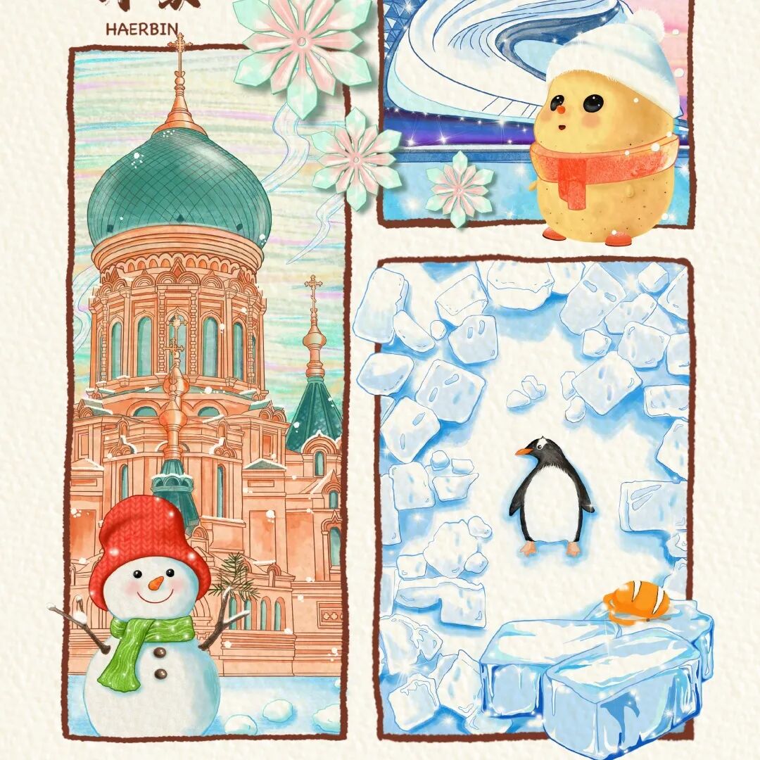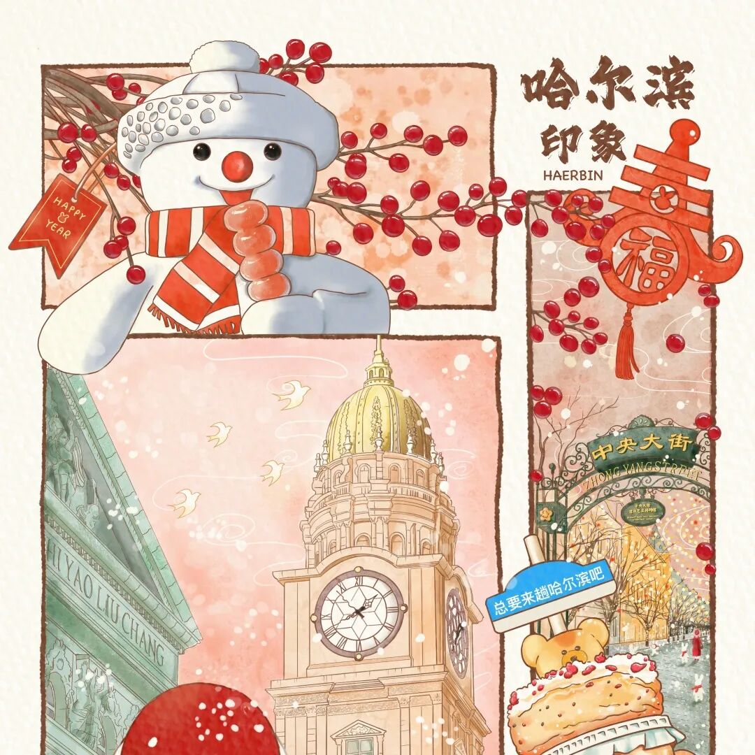 我出生于哈尔滨,对冰天雪地有着自己的理解,冰雪的美是刻在血液里的。成长的记忆中,每一年我都会对冰雪进行创作,就如每一年的雪花,如约而至。长年的创作积累了许多关于冰雪的作品。我在教授美术课时,也会带领学生进行冰雪题材作品的创作,也常常能够感受到哈尔滨本地的孩子们对冰雪的热爱。正是浪漫的冰雪滋养了我,从事插画工作的空余时间就用于创作关于哈尔滨的插画,让我收获了许多朋友的关注与喜欢。今年创作了一系列哈尔滨印象插画收到了来自全国各地朋友的喜爱,作为一名插画师把家乡的美展现出来是我最大的收获。