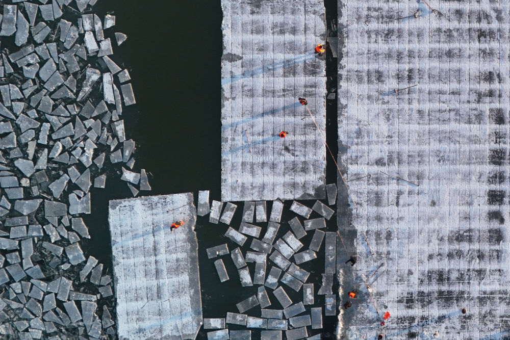 工人在松花江上的采冰现场进行采冰作业(无人机照片,2023年12月4日摄)。 新华社记者 张涛 摄