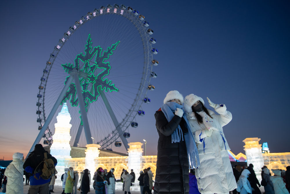 白天晶莹如玉,夜晚斑斓如画,在冰雪建筑前,游客纷纷拍照留念;大雪花摩天轮优雅旋转,给夜空增添静谧气息;521米超长大滑梯流光溢彩,来自人群的呼喊、尖叫、欢笑融在一起,一浪高过一浪……
