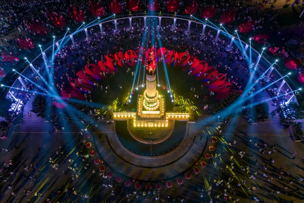 哈尔滨防洪胜利纪念塔广场的灯光秀 新华社记者 张涛 摄