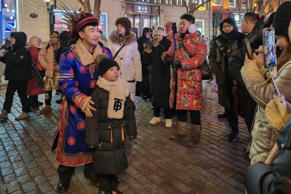 达斡尔族小伙儿在哈尔滨中央大街与游客合影(1月9日摄)。新华社记者 朱悦 摄