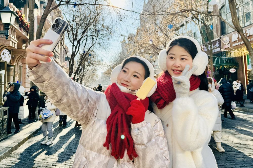 两名外地游客在哈尔滨中央大街自拍(1月10日摄)。新华社记者 杨思琪 摄