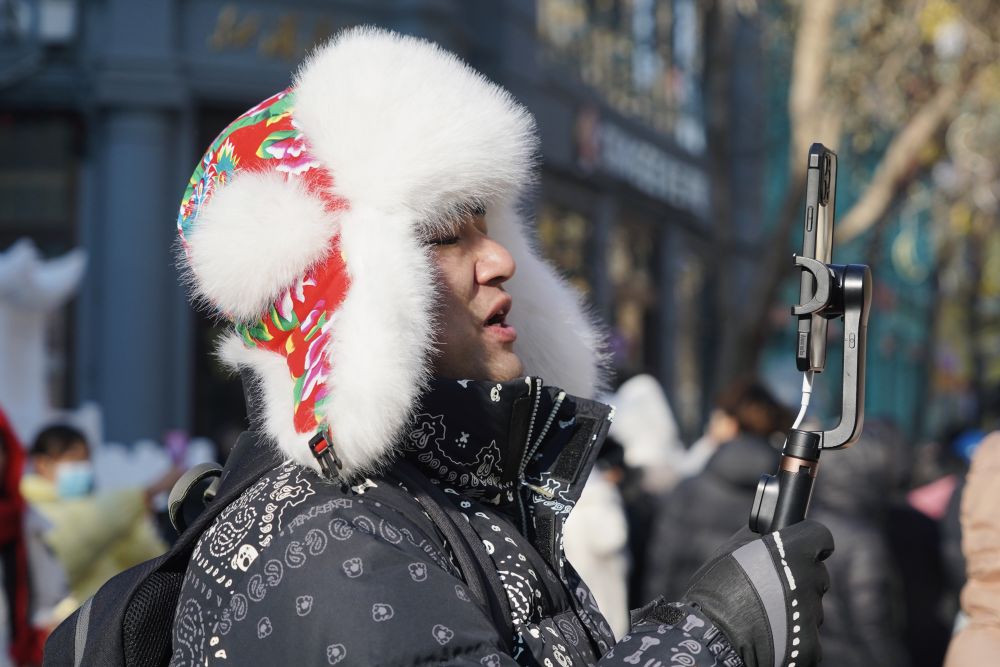 一名博主在哈尔滨中央大街进行直播(1月10日摄)。新华社记者 何山 摄