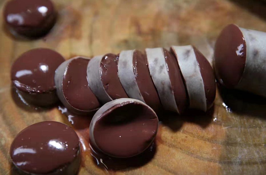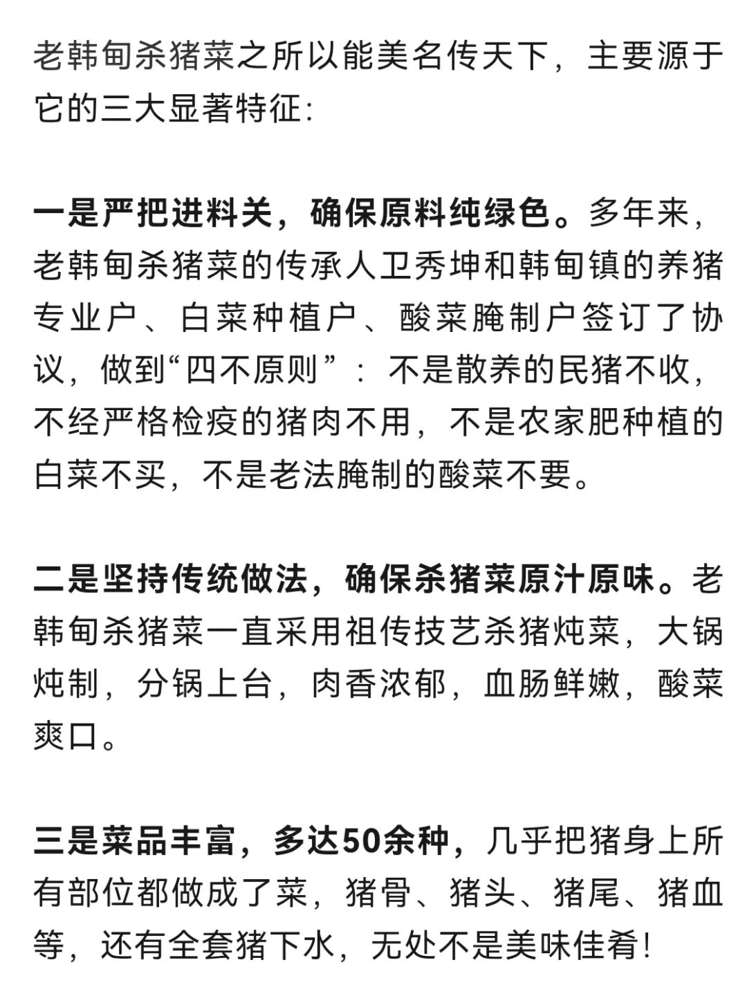 酸菜需要选择低温腌制六个月以上的黄心酸菜;酸菜锅中的肉是一头猪选出来四斤三指膘的精五花肉;血肠的制作要选用新鲜猪血,血肠皮要选用明肠,薄厚适中香脆弹牙;大肠灌肉,一头猪只能灌一根,选用猪大肠头,一头猪有一尺左右,肉是选用猪颈部梅花肉,切成条腌制十二小时后灌入肠内。