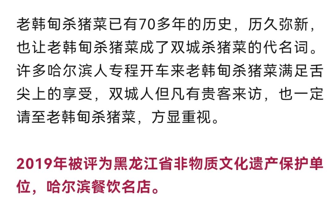 兰棱杀猪菜源于满族官方祭祀,经七代传承,目前,已列入黑龙江省非物质文化遗产,享有“龙江老字号”的美称,入选过大坂G20首脑峰会晚宴菜单,选材考究,做工精细,是东北人宴请贵宾,招待亲朋好友的不二之选。