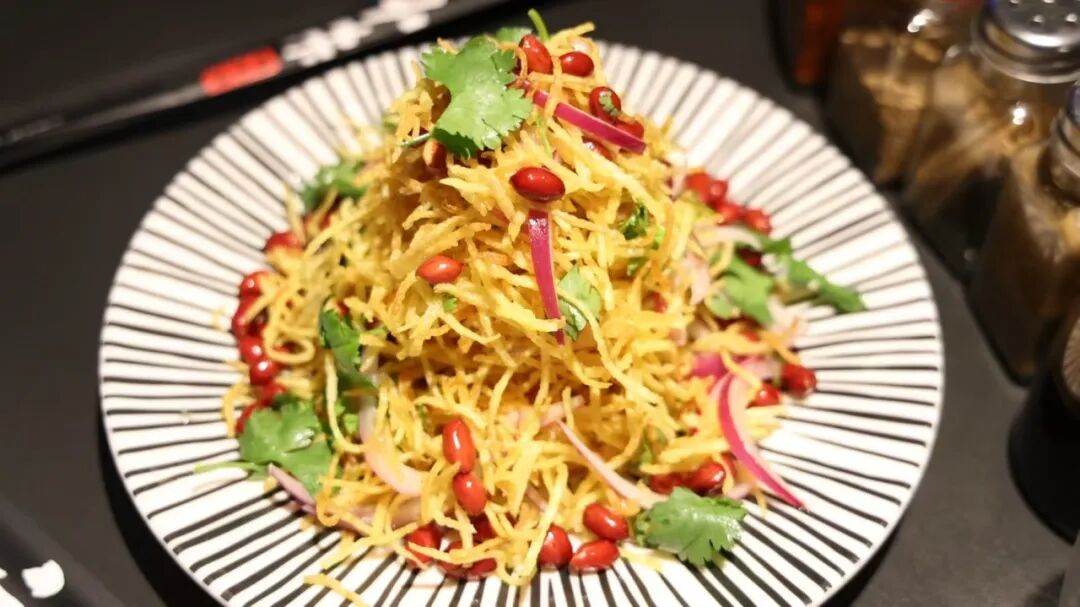 三丝爆豆以土豆、圆葱、花生、香菜为主要食材,口感酥酥脆脆,味道酸酸甜甜,是一道老少皆宜的小吃。外表黄金酥脆,非常适合在夏天品尝。