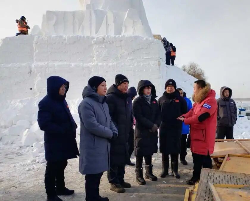 At the Sun Island International Snow Sculpture Art Expo, Lan Feng inspected the construction of various snow sculptures and checked the operation situation of the Expo, the composition of tourists, and the safety working plan. She stressed that the staff should take practical and effective measures to prevent tourists and staff from falling, frostbite, crowding and so on.
