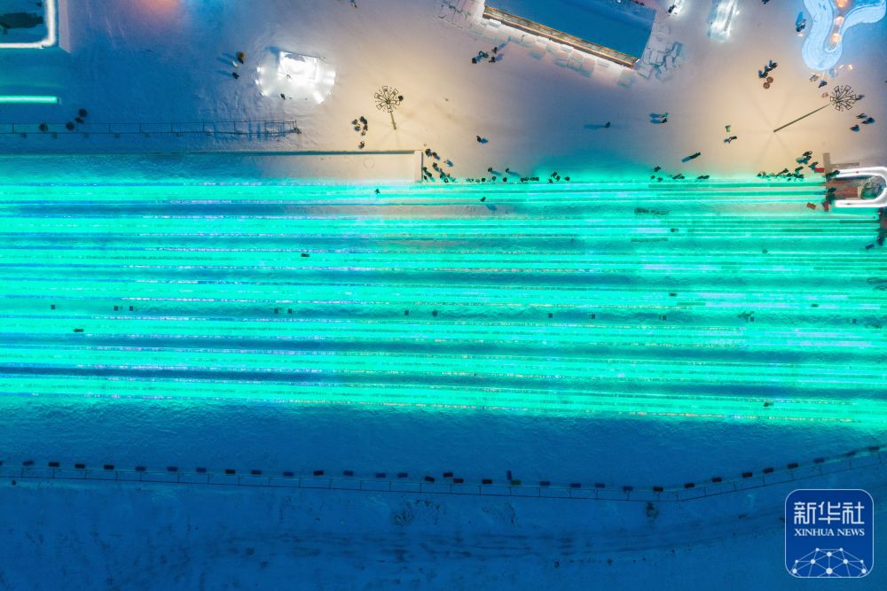 ↑游客在哈尔滨冰雪大世界园区体验超级冰滑梯(1月1日摄,无人机照片)。