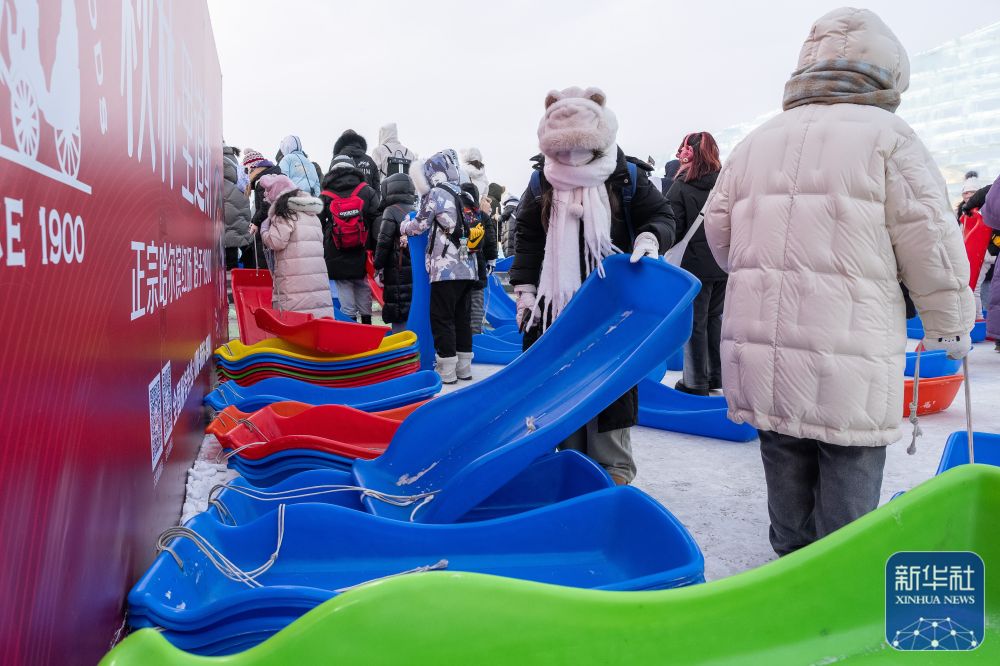 ↑在哈尔滨冰雪大世界园区,游客领取滑雪板,等待体验超级冰滑梯(1月1日摄)。