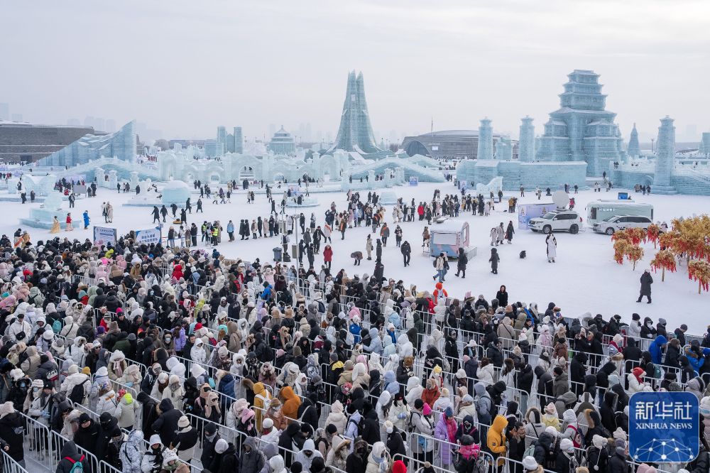 ↑游客在哈尔滨冰雪大世界园区排队,等待体验超级冰滑梯(1月1日摄)。