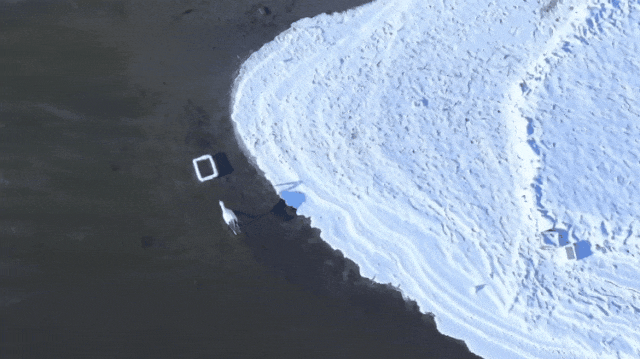 杨威被迷住了,从此天天都来寻找,却只在岸边浅滩上发现了一串串鸟的脚印。直到10日,杨威和拍友老白终于用无人机镜头看清了它们——国家一级保护动物东方白鹳。“我以前拍摄过迁徙的东方白鹳,怕认错又请专家鉴定,得到了肯定的答复。这让我们特别兴奋,本该迁徙南方的东方白鹳留在哈尔滨过冬,从未见过。”
