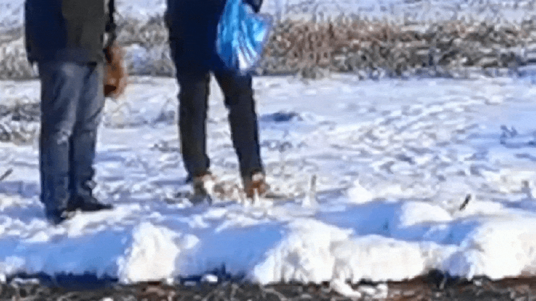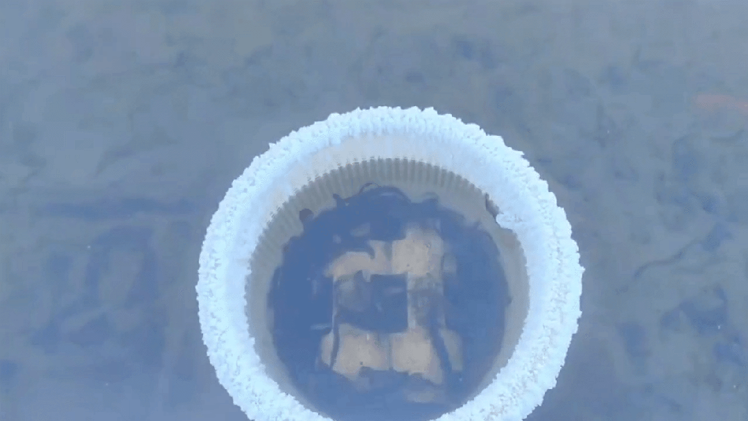 2024.01.18 林草局的三个工作人员又来给喂食。他们在水里下了一个白色的带网眼儿的筐,里面放砖压住,鱼倒进去,游不出来。好办法。