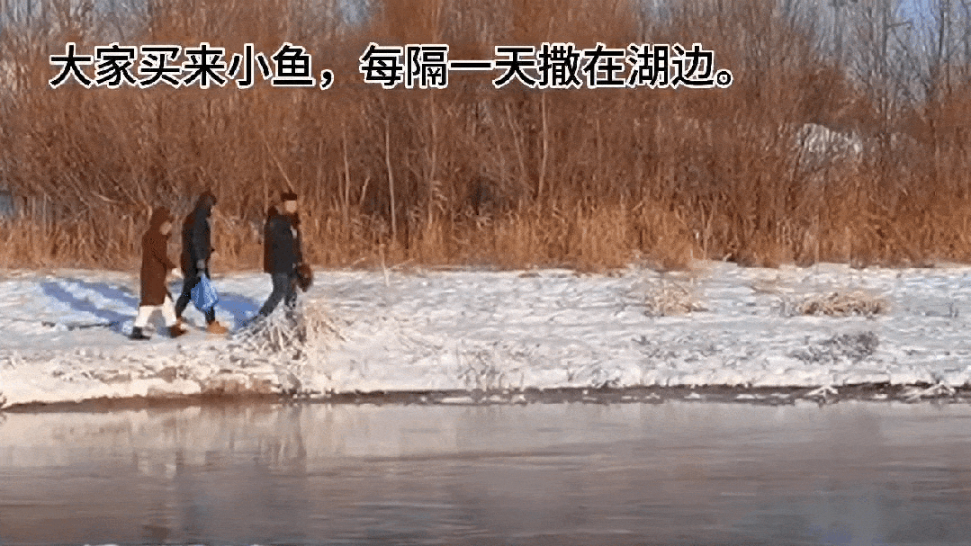 野鸭湖的活水面积随着气温和水温随时变大变小。面积适中时,可以直接把鱼撒在水边。就是这样也有风险,一次,老白端着一篮子鱼,深一脚浅一脚地寻找合适的位置,不料一脚踩碎薄冰掉进水里,“零下20多摄氏度浑身湿透,只好回到岸上先回家换了衣服再来投喂,这样的落水,我经历了3次。”