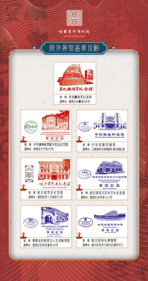 亲爱的游客朋友们,您是否曾经为了集满心仪已久的哈尔滨市博物馆文创印章而四处奔波?现在,哈尔滨市博物馆为你准备了一份《博物馆集章攻略》,赶紧码住“集”起来吧!