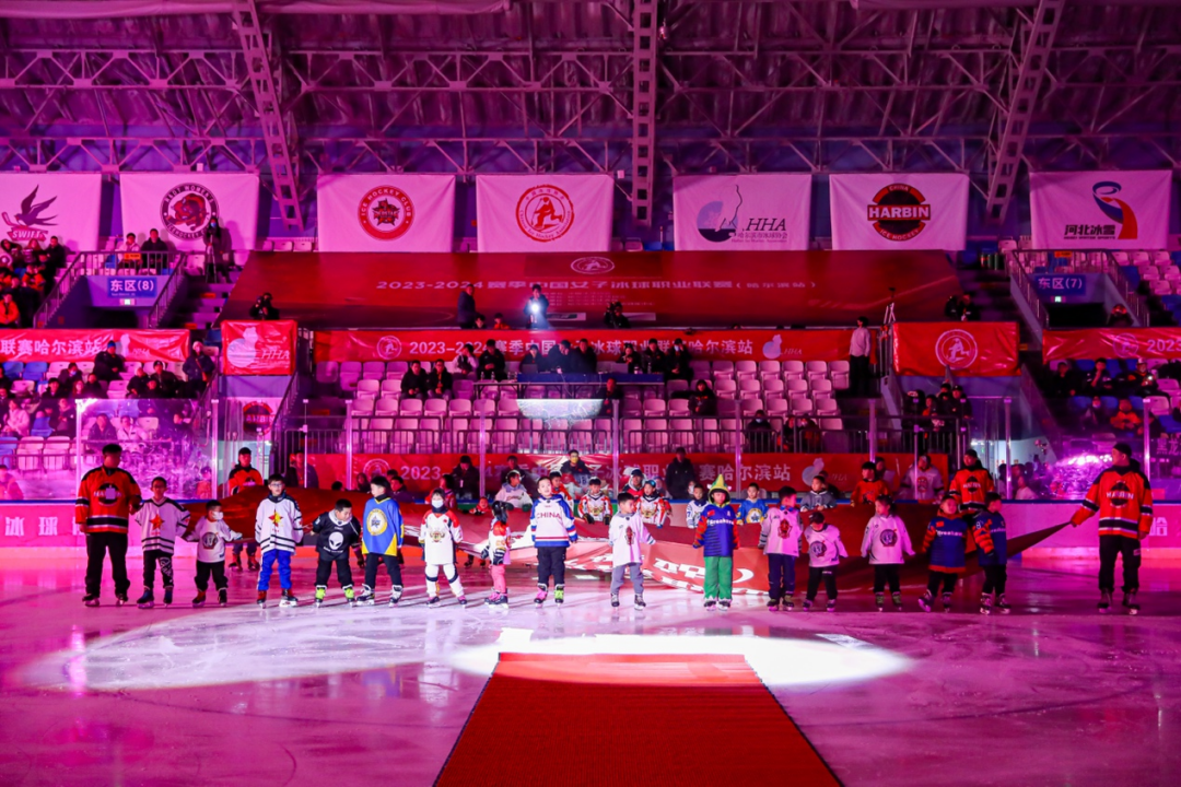 2023年12月9日,2023-2024赛季中国女子冰球职业联赛(以下简称“女冰联赛”)哈尔滨站开幕式在哈尔滨市哈尔滨冰球馆举行。中国冰球协会主席王玄、中国冰球协会副主席、黑龙江体育职业学院院长杨永生、国家体育总局体育器材装备中心市场开发处处长张亚欣、哈尔滨市体育局党组书记、局长赵竹帛出席开幕式,相关单位及企业领导一同出席。开幕式在雄壮的国歌声中开始。