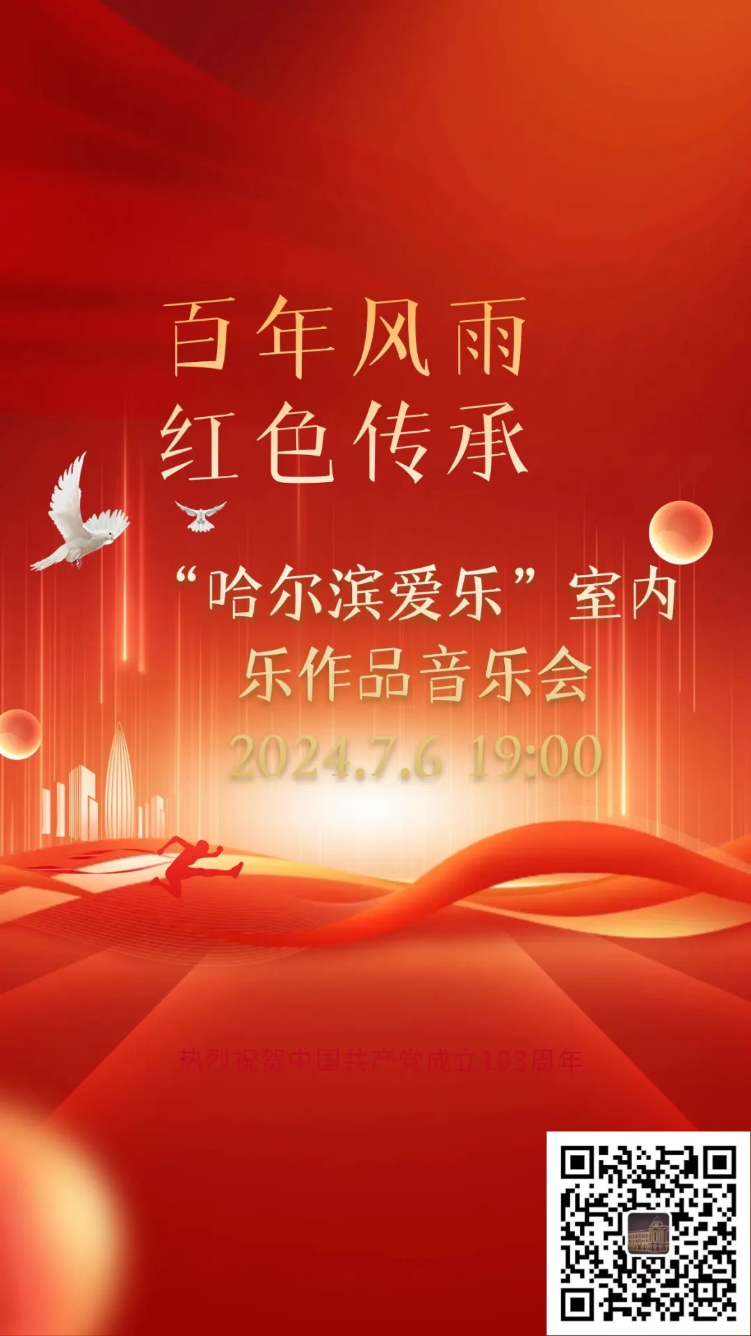 值此建党103周年之际,由哈尔滨格拉祖诺夫室内合唱团送上红色主题室内乐演出,弘扬红色精神,营造颂党敬党爱党的浓厚氛围。本场音乐会将演出女声合唱《绒花》、混声合唱 《沂蒙山歌》、女声合唱《唱支山歌给党听》等曲目。