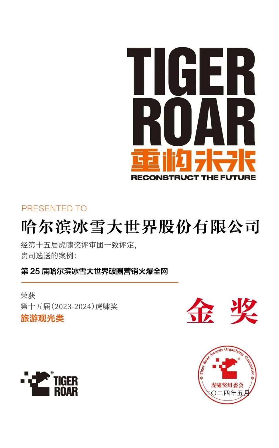 荣获第十五届虎啸奖营销案例旅游观光类金奖的“第25届哈尔滨冰雪大世界破圈营销火爆全网”案例由哈尔滨冰雪大世界股份有限公司策划推出