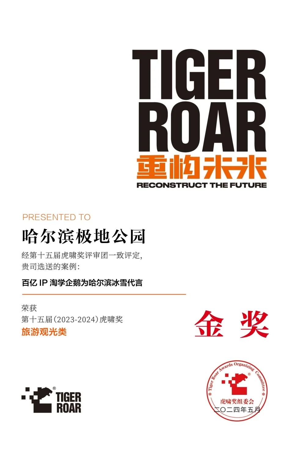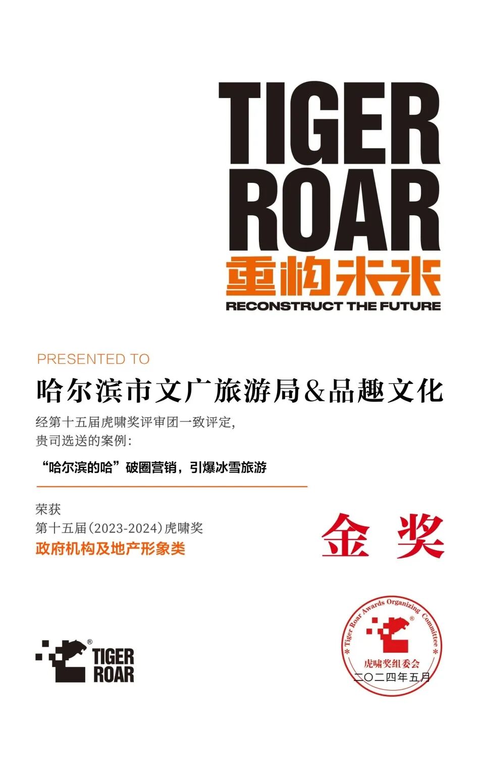 5月30日作为中国品牌营销数字化领域的专业性奖项——第十五届虎啸奖颁奖典礼在上海举行。“‘哈尔滨的哈’破圈营销,引爆冰雪旅游”“第25届哈尔滨冰雪大世界破圈营销火爆全网”和“百亿IP淘学企鹅为哈尔滨冰雪代言”案例,经过线上、线下评审,答辩等环节,最终从4500 件参赛案例中脱颖而出,勇夺三项金奖。