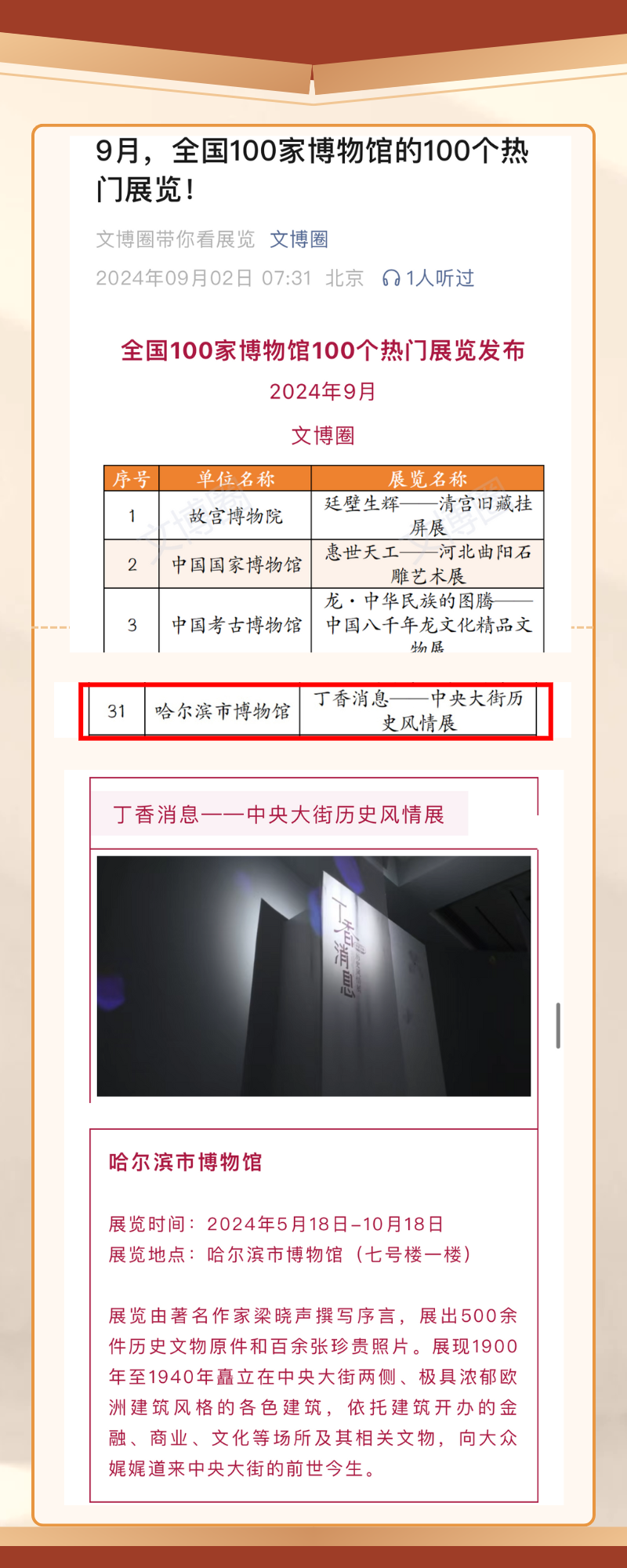 9月2日,哈尔滨市博物馆的“丁香消息——中央大街历史风情展”入选“文博圈”全国100家博物馆的100个热门展览,位列三十一,全省仅有两家入选。