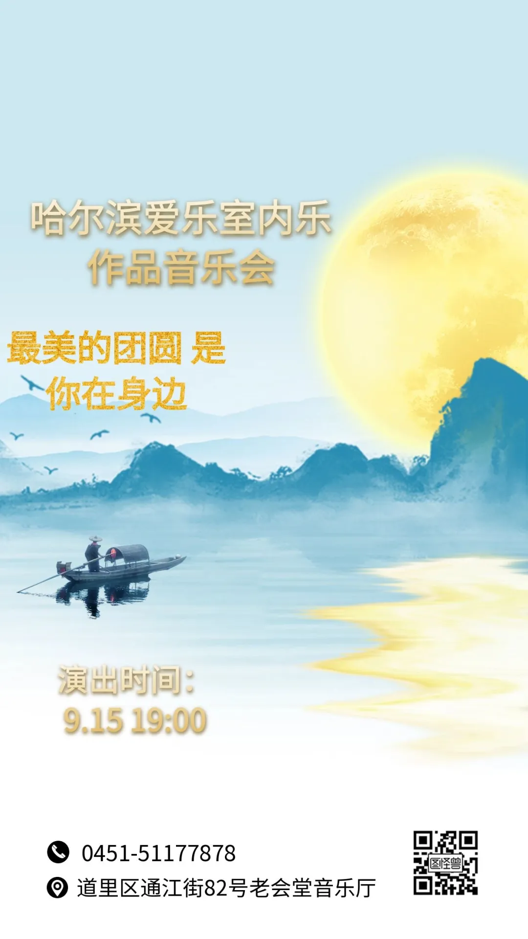 哈尔滨市爱乐室内乐团以演奏高雅音乐、传承城市精神、弘扬优秀文化为宗旨,把形式各异和内容不同的音乐沙龙和公益演出及主题音乐会呈现给广大观众,以此助力培植音乐文化土壤,丰富城市文化生活。本场音乐会将演奏《月亮代表我的心》《良宵》等歌曲,共迎中秋佳节。