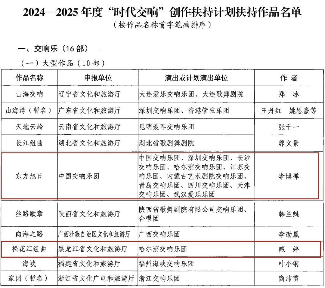日前,由文化和旅游部主办的2024-2025年度“时代交响”创作扶持计划扶持作品名单公布,全国共有16部交响乐作品入选。其中包括由哈尔滨交响乐团在内的国内十大交响乐团联合委约的交响套曲《东方旭日》、由哈尔滨交响乐团单独委约的交响组曲《松花江组曲》。