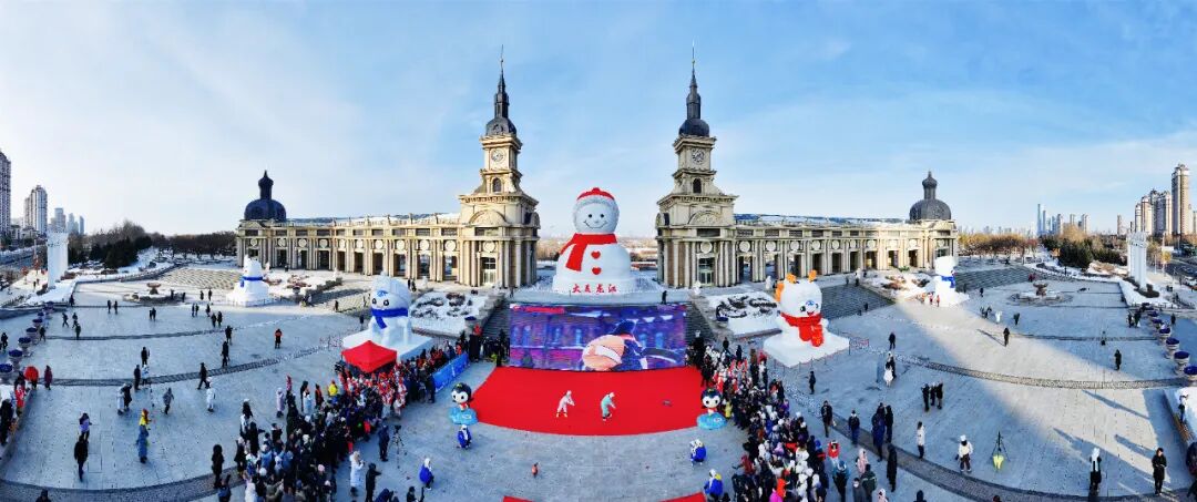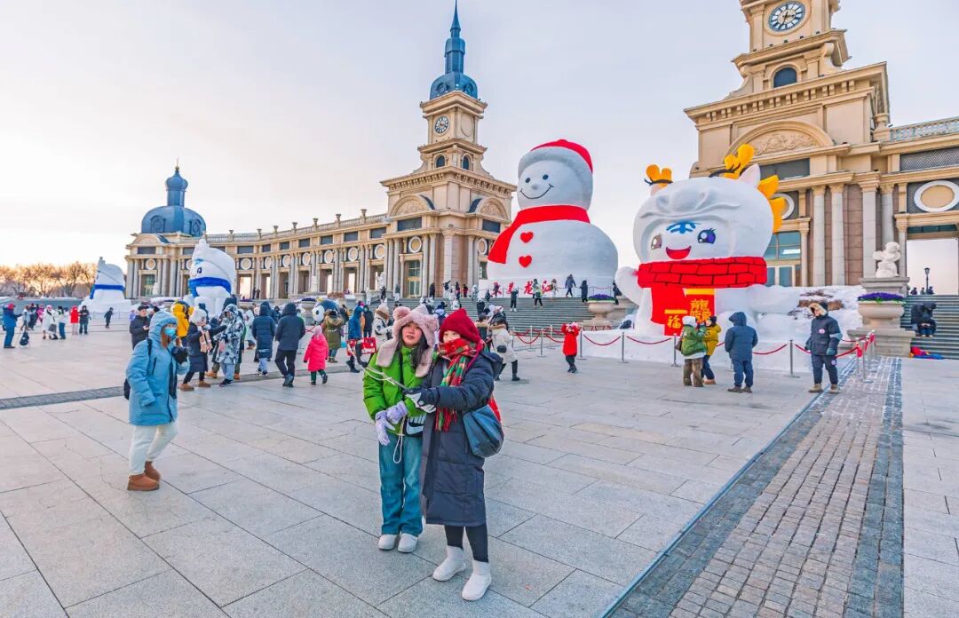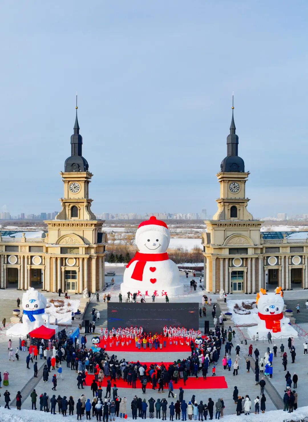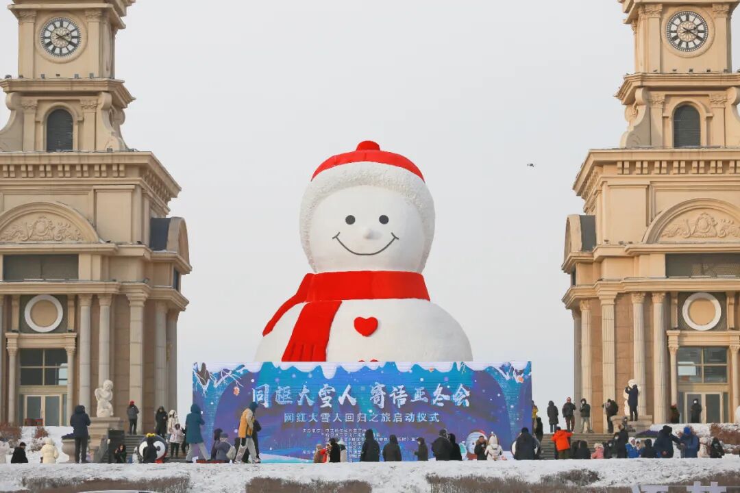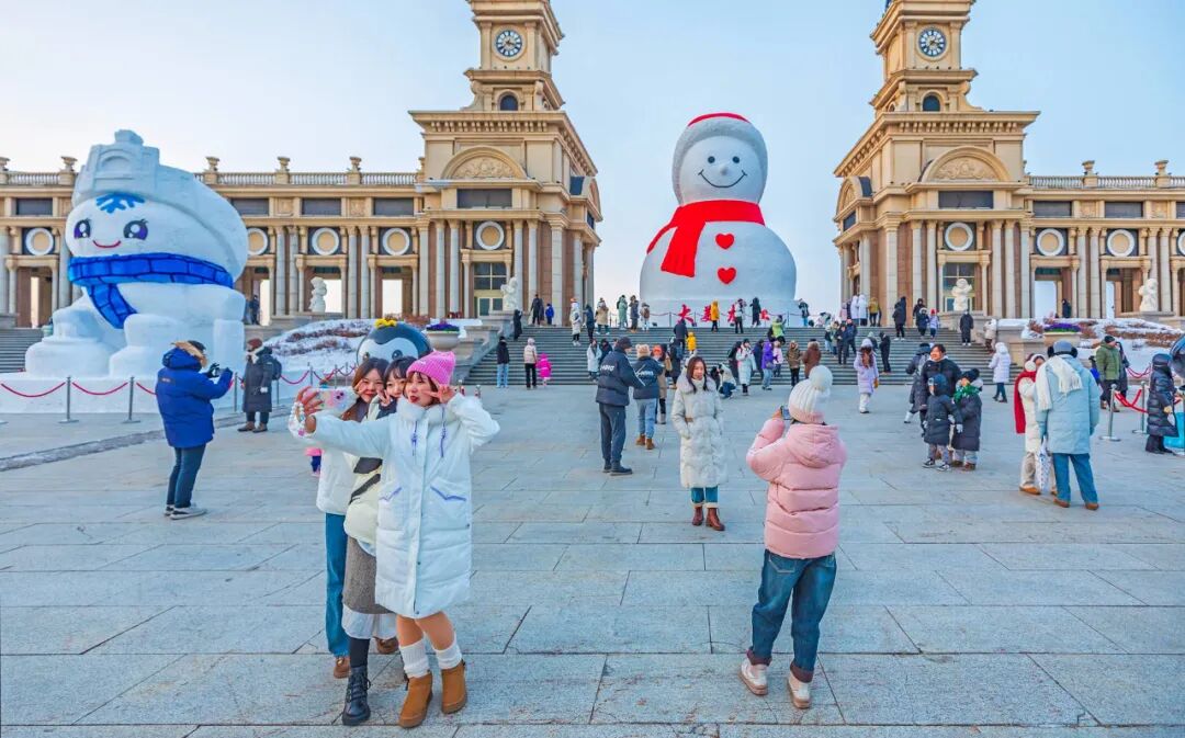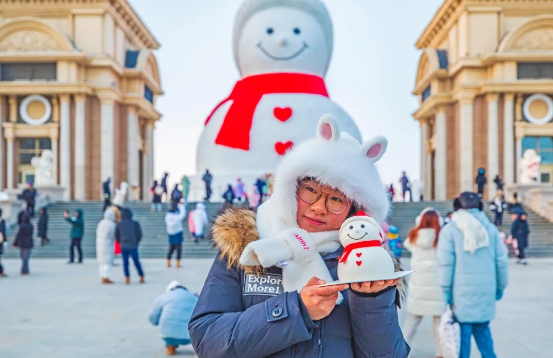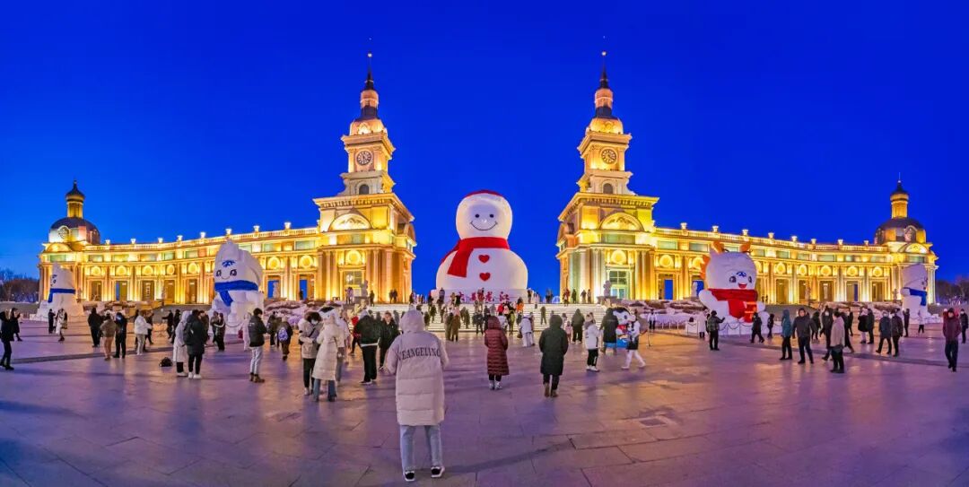 当夜色升起,灯火辉煌时,夜景模式下18米高的大雪人安静又治愈。今年,他还带来了她的好朋友——超级网红、来自哈尔滨极地公园的“淘学企鹅”以及摆有雪圈滑雪、单板滑雪、冰壶、龙年造型的雪雕景观。
