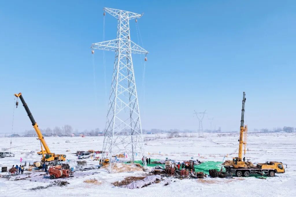 3月21日,国网哈尔滨供电公司五常帽东220千伏线路工程施工现场,作业人员加紧施工,力争早日竣工送电。