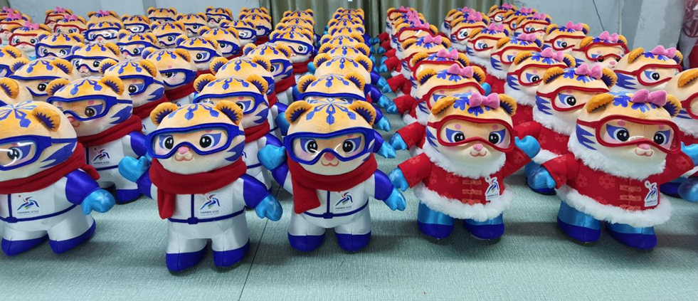 在吉祥物毛绒公仔的设计开发阶段,为了确保选料和工艺的准确性,设计团队与工厂技术团队进行了多次深入的讨论和测试。经过慎重考虑,最终决定使用水晶超柔布料来制作吉祥物的头部,这种材料柔软舒适,触感极佳。同时,为了呼应滑冰服的质感,选用了光平布来制作“滨滨”的衣服,这种布料光滑细腻,非常适合表现冰雪主题。而“妮妮”的衣服则选用与东北花袄相似的帆布制作,这种布料纹理独特,能够很好地展现出东北地区的传统特色。