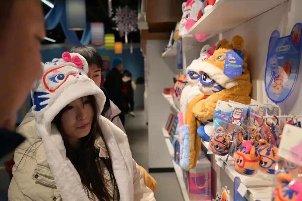 “这里的文创产品种类很多,有常见的冰箱贴、挂饰,还有很多有加热功能的产品,很有东北特色。”来自沈阳的孙曼迪和妈妈兴致勃勃地试戴起加热虎头连帽围巾,帽子上的亚冬会吉祥物“滨滨”“妮妮”活泼可爱。