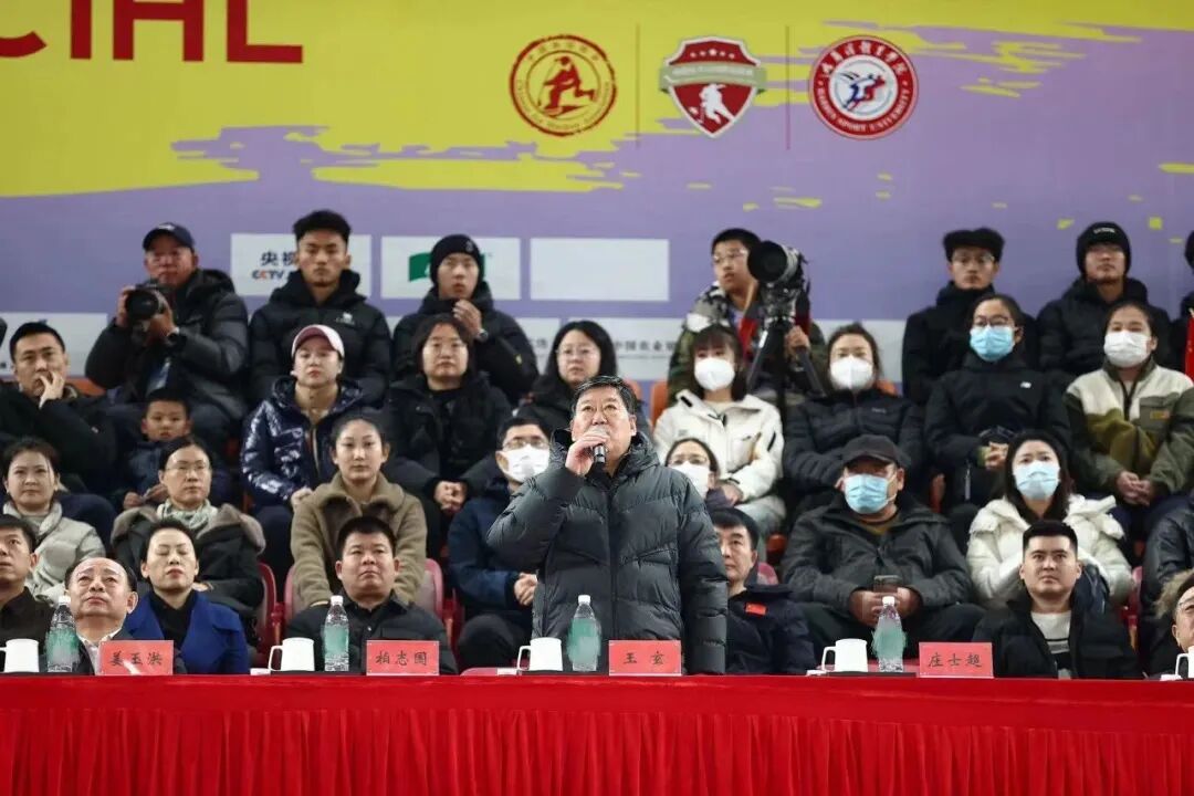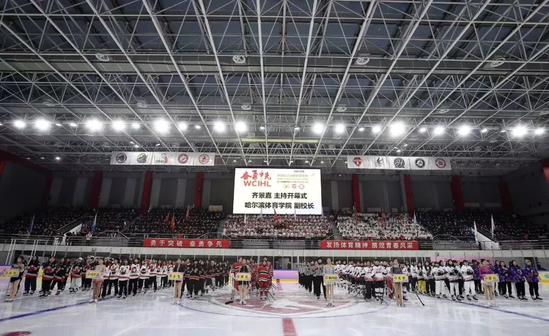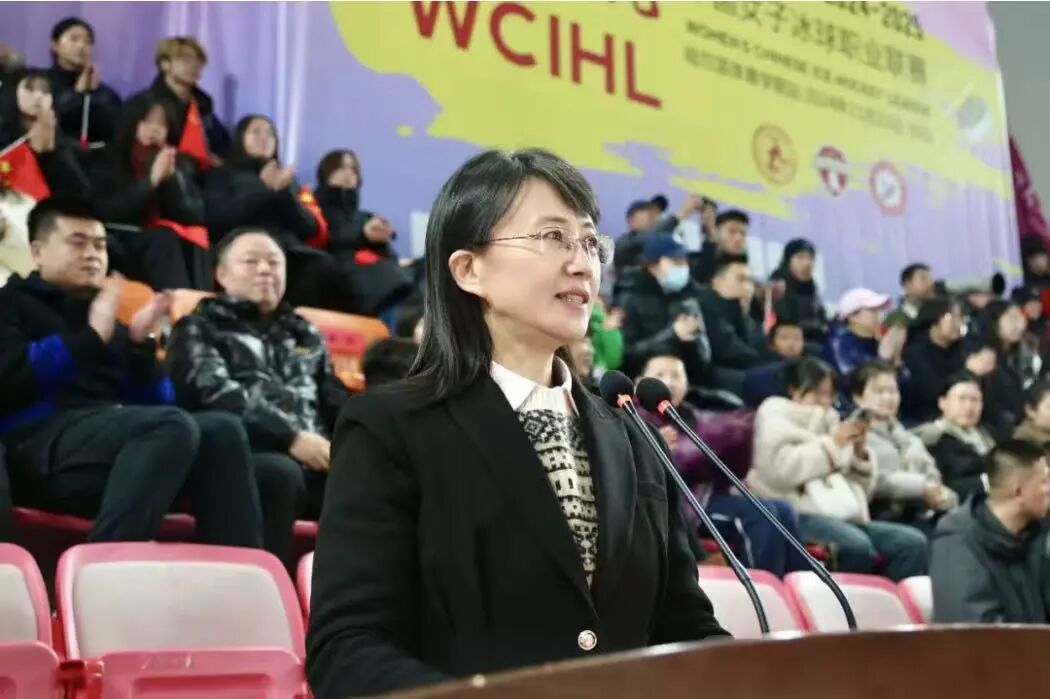 哈尔滨体育学院校长姜玉洪致开幕辞。他表示:“中国女子冰球职业联赛,作为国内最高水平的女冰赛事,不仅是高水平的竞技盛宴,更是中国女冰的形象展现。7支女子冰球队伍将用汗水和拼搏书写辉煌的篇章,将用精湛的技艺、顽强的斗志和良好的体育道德风尚为我们带来精彩绝伦的视觉盛宴。本次比赛也将进一步测试和检验大学生滑冰馆场地及赛事保障的运行,确保哈尔滨2025年第九届亚冬会女子冰球比赛顺利进行。”