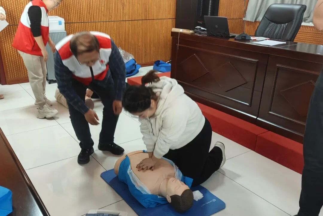 培训期间,红十字会专业救护人员通过“理论讲解+实操演练+情景模拟”的方式围绕气道异物梗阻(海姆立克急救法)、心肺复苏、AED运用等开展应急救护理论讲解和实操指导,结合日常生活和突发事件,为参训学员直观、详细讲解了正确有效的急救措施,学员们认真听讲,学习热情高涨,踊跃参与实操演练。