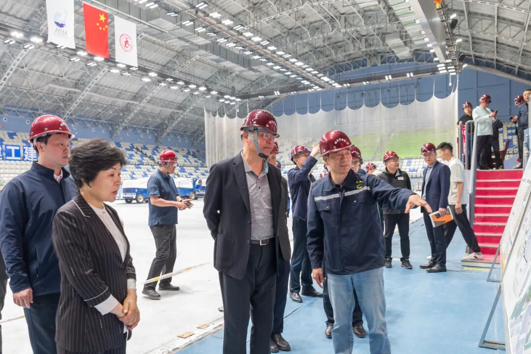 在考察现场,场馆施工负责人向考察组介绍了开闭幕式场馆的设计理念、施工进度、施工标准及技术工艺。考察组对亚冬会比赛场馆及配套设施升级改造工程项目,以及相关设施的布局设计,给予了专业指导。