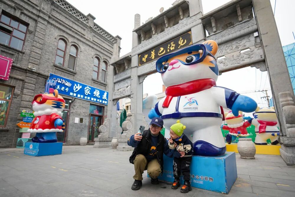 ↑在哈尔滨中华巴洛克历史文化街区,游客与亚冬会吉祥物雕塑合影(10月29日摄)新华社记者 王建威 摄