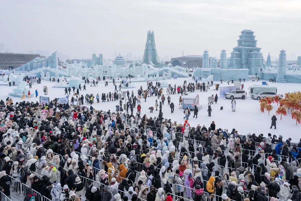 ↑2024年1月1日,游客在哈尔滨冰雪大世界园区排队,等待体验超级冰滑梯 新华社记者 谢剑飞 摄