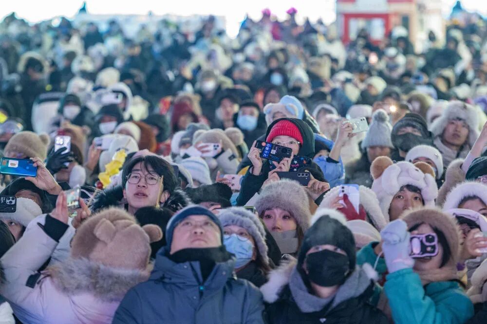 ↑2024年1月5日,在哈尔滨冰雪大世界园区,游客观看第40届中国·哈尔滨国际冰雪节开幕式 新华社记者 谢剑飞 摄