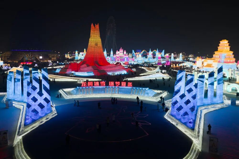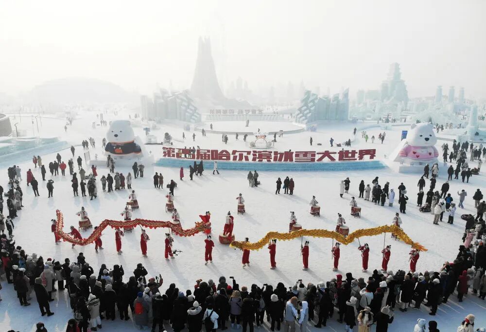 ↑2024年2月10日,游客在哈尔滨冰雪大世界园区内观看舞龙表演(无人机照片) 新华社记者 王建威 摄