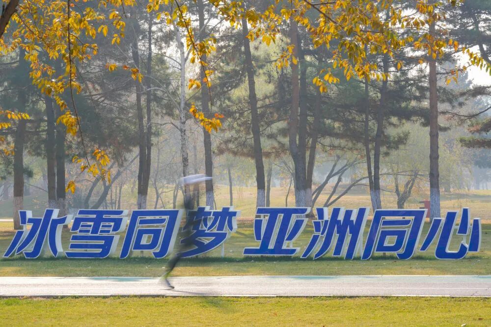 ↑在哈尔滨市湘江公园,市民跑步经过亚冬会主题景观(10月30日摄) 新华社记者 王建威 摄