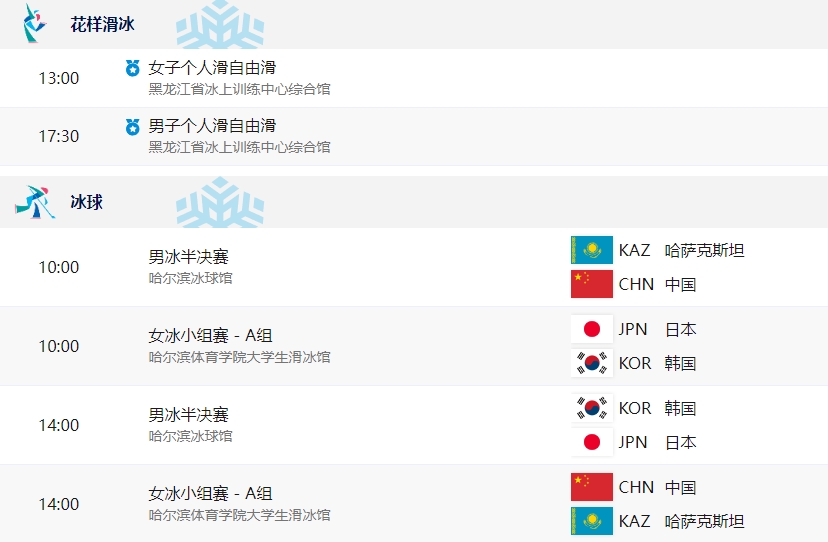 哈尔滨亚冬会2月13日赛程预告