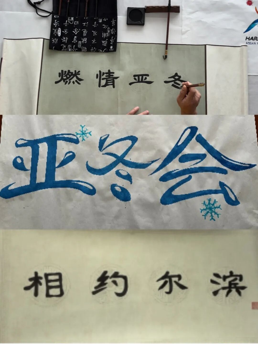 学生们现场书写的中文书法作品都成功地吸引了当地民众和游客们驻足观看。笔墨飘香抒发心意,广大华裔新生代的学生和家长们通过书法作品向游客们讲解了中华书法悠久历史和中华文化的艺术魅力,表达着海外华侨华人对欢聚冰雪盛地、共享亚冬盛会的热情和对哈尔滨2025年第九届亚冬会成功举办的美好祝愿。