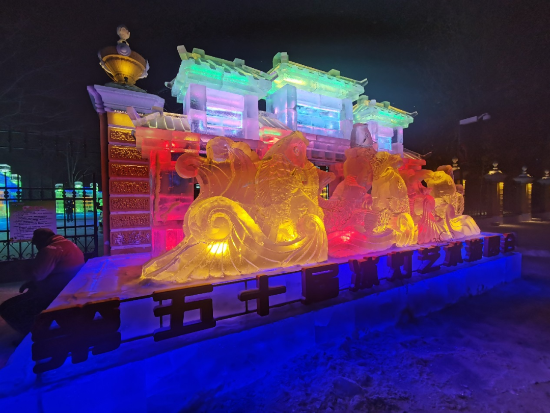 在森林街门前处打造冰雕《鱼跃龙门》,描绘鲤鱼跃龙门的经典场景,五条鲤鱼逆流而上、鱼跃龙门,寄托了第五十届冰灯艺术游园会奋发向上、再创佳绩的美好愿望。在南门及前导区打造《祥龙献瑞》,两侧搭配十二生肖镂空墙,意为“祥龙舞动,呈现吉祥”。